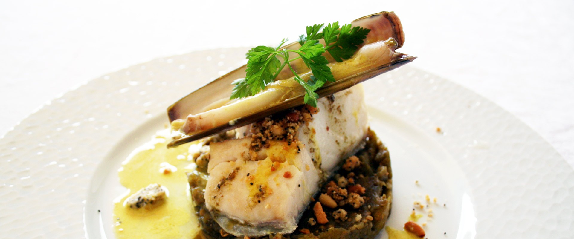 Le pavé de Merlu sauvage rôti aux sésames, risotto crémeux au fenouil, jus coquillages safran | 23,50 €
